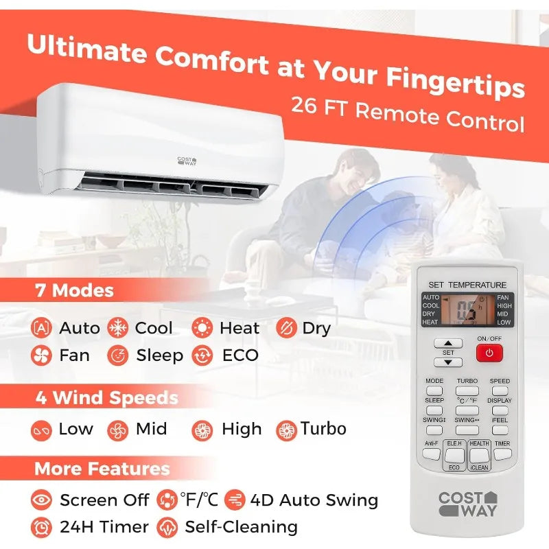 - [Self Cleaning & Auto Defrost:]Designed with a self-cleaning function at high temperature of 134.6℉ and a washable filter, this split air conditioner can automatically clean its interior and keep the air in your home fresh and clean. Moreover, the outdoor unit features an auto-defrost function to avoid damage and improve energy efficiency.