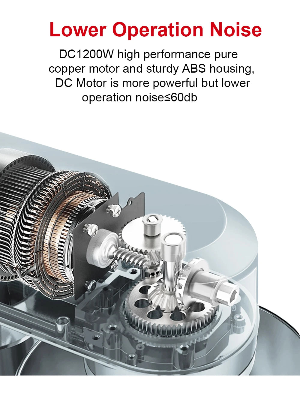 【1200W Powerful DC Motor & Accurate 6 + P Speed Control】The BioloMix 6L stand mixer uses a max 1200W high-end pure copper DC quiet motor with high operating efficiency, equipped with hall sensors and additional pulse settings. 6 optimized speeds with timer function easily knead doughs, thick batters, meringues and whipped cream.