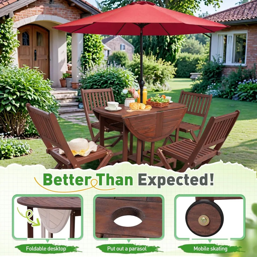 100% SOLID WOOD FRAME: The whole frame of this patio table and chairs set is completely made of acacia wood with a layer of varnish on the surface, the wood material is stable, weatherproof and fade-proof, durable in any weather, and safer and more environmentally friendly. STRUCTURAL DESIGN IS SOLID AND REASONABLE: This outdoor dining table and chairs set has a hole at the top and bottom of the table top to place umbrellas, the table frame is designed in the shape of a cross, this structure enhances the stability of the table and fixes the umbrellas to make sure that you can enjoy your leisure time to your heart's content. LARGE TABLE TABLE TABLE: The 39.4*39.4 inches large table top can hold a variety of fruits and snacks for you to enjoy afternoon tea time with your family and friends, ideal for garden, patio, lawn, porch. SAVE SPACE AND TIME: The round table and chairs of the dining set are foldable design, the folded 4 chairs can be put into the table belly, only a small space is needed to put them down perfectly. The surface of the table and chairs can be wiped clean with gauze. ASSEMBLY REQUIRED: This acacia wood furniture set includes a foldable round table and 4 foldable chairs, the chairs are ready to use without installation, the table may need some time to assemble, the package will have installation instructions to save your assembly time.