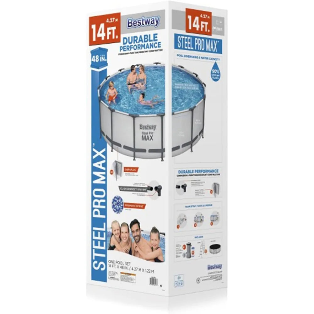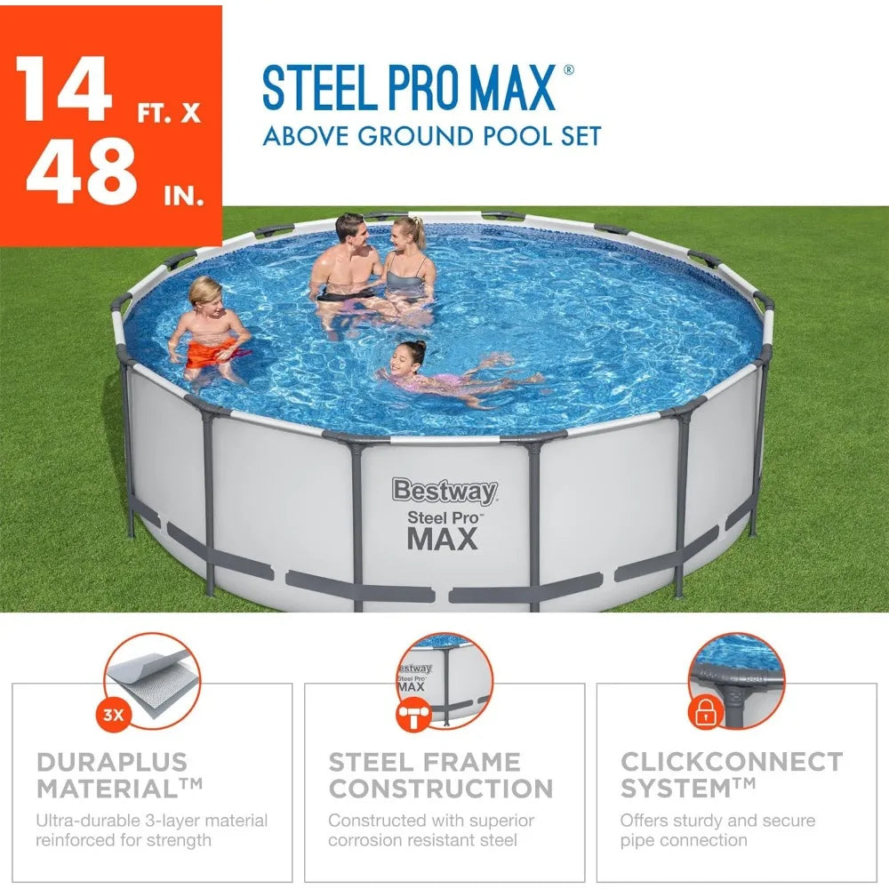 All ages will enjoy swimming and splashing all summer long in this 18-foot by 48-inch round above-ground pool; Includes a model 58390E 1,500-gallon filter pump, a ladder, and a pool cover
